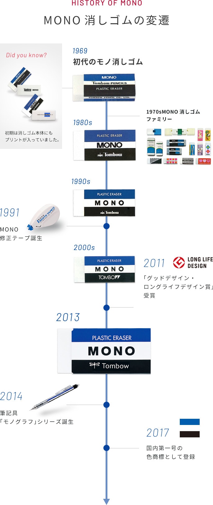 現在、「MONO消しゴム」をはじめ、個性あふれる「MONOシリーズ」は誕生からの「比類なき」「唯一の」という想いを受け継ぎながら時代の変化に合わせて進化を続けています。